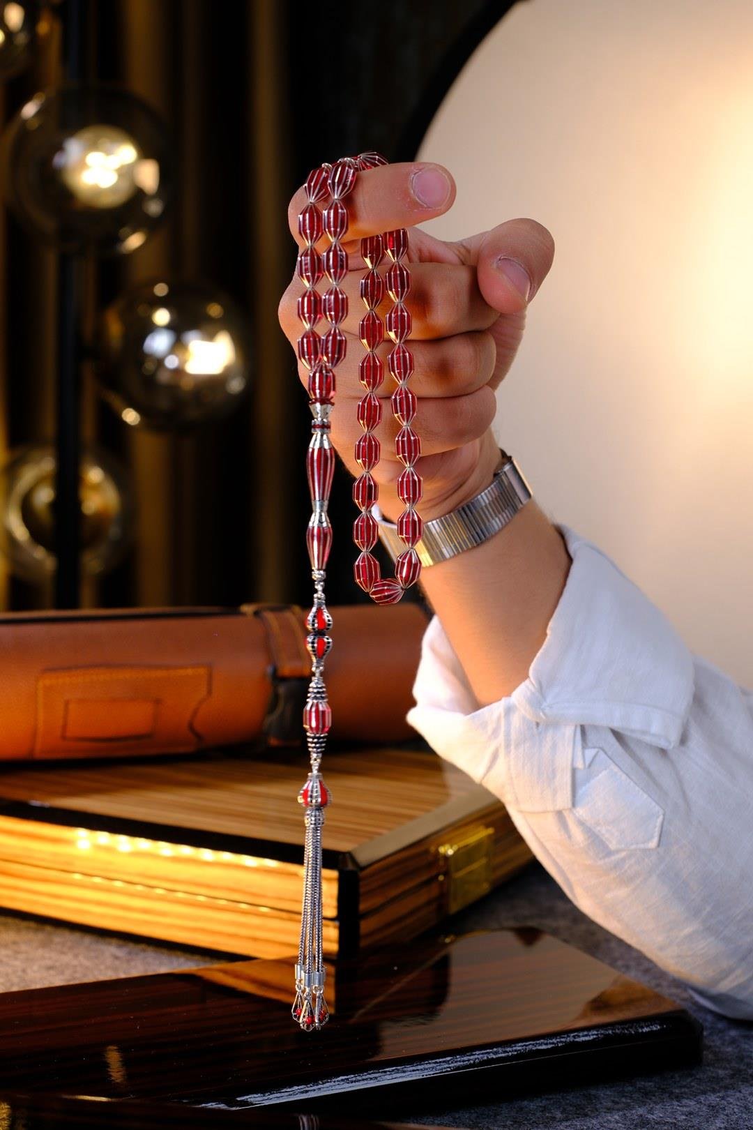 Sürmeli Pres Kehribar Gümüş= Pres kehribar'dan ve atölye işçiliği kullanılarak üretilen bu kehribar benzeri tesbih modeli, kırmızı ve beyaz renkleri ile dikkati çekmektedir. İmamesi dahil olmak üzere toplamda 21 cm uzunluğundadır.Bu modelin boncukları 7 x 11 mm boyutlarındadır. İmamesinde de olduğu gibi gümüş püskülleri vardır. Tekli ve çiftli çekim için uygun olan bu model, günlük kullanıma uygun olmak ile beraber, hediyelik veya koleksiyon eşyası olarak da kullanılabilir.
